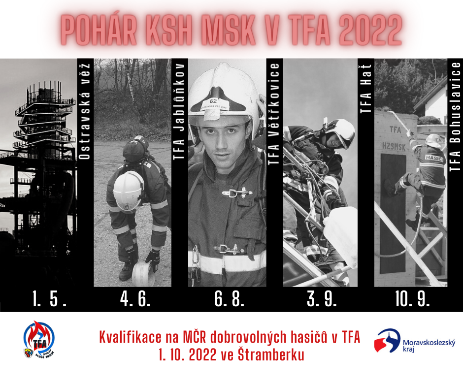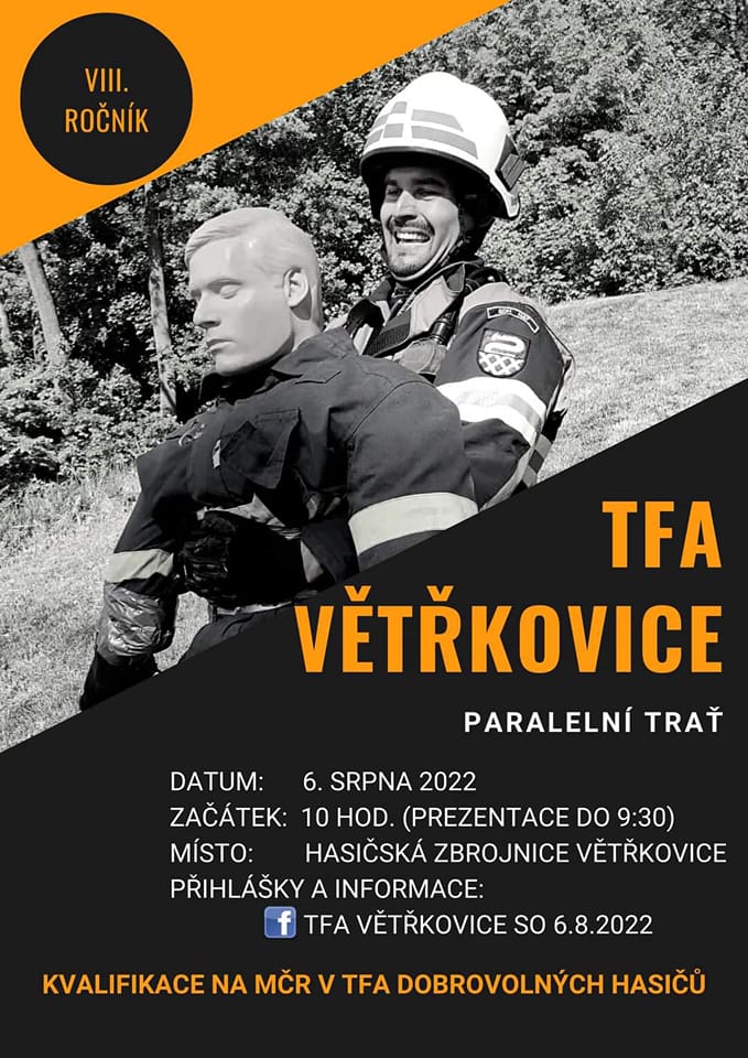 | 26.7.2022 | TFA Vetřkovice 6.8.2022 Trat je stejná jako v roce 2020,je paralelní,po celou dobu bude na ukázce spec.automobil Triton,po závodě pěna a v blízkosti bazén, závod je součástí poháru KSH MSK v TFA ,ze kterého vzejdou reprezentanti našeho MS kraje na MČR v TFA pro dobr.hasiče konané 1.10.2022 ve Štramberku. |