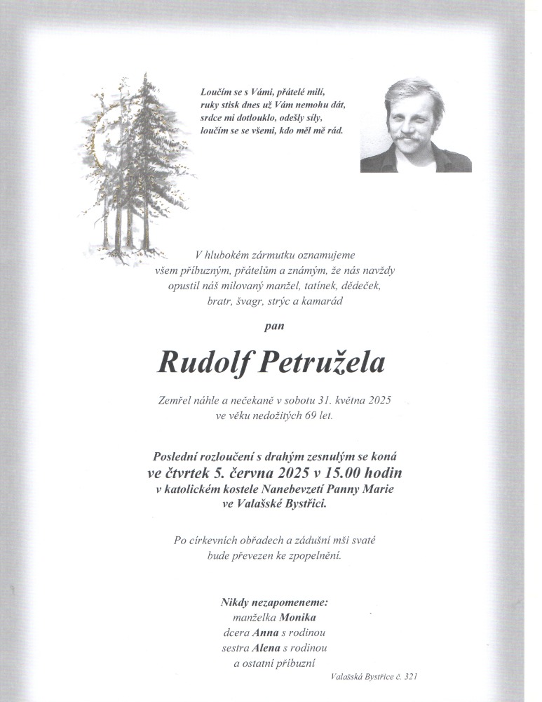 Bratr Rudolf Petružela byl dlouholetým členem a funkcionářem Sboru dobrovolných hasičů Valašská Bystřice. Čest jeho památce.