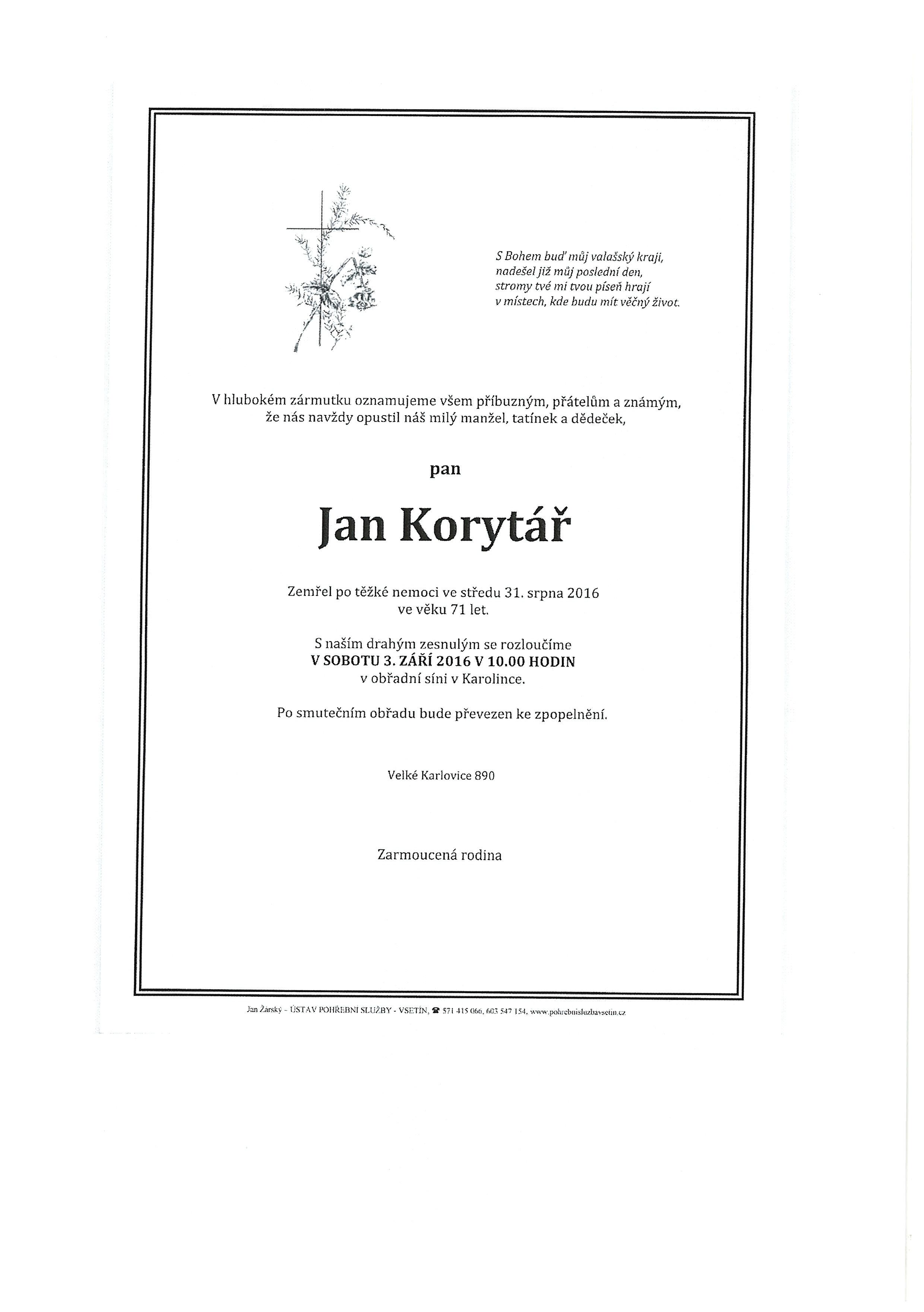 | 1.9.2016 | Smuteční oznámení Pan Jan Korytář byl dlouholetým členem Sboru dobrovolných hasičů Velké Karlovice - Podťaté, pracoval ve funkci velitele okrsku č. 4 Velké Karlovice. ![]() |