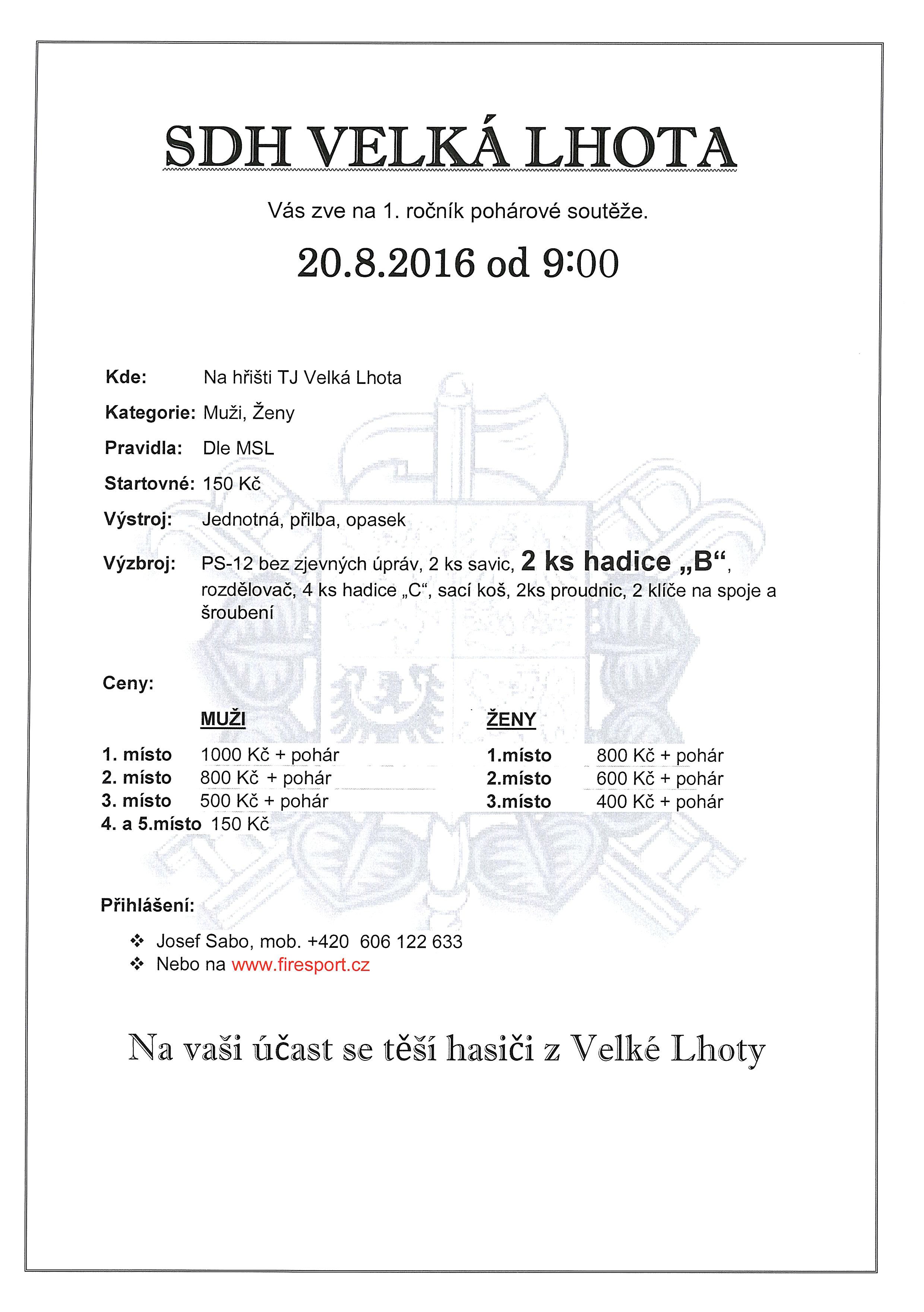 | 8.8.2016 | Pozvánka na soutěž Velká Lhota 20.8.2016 |