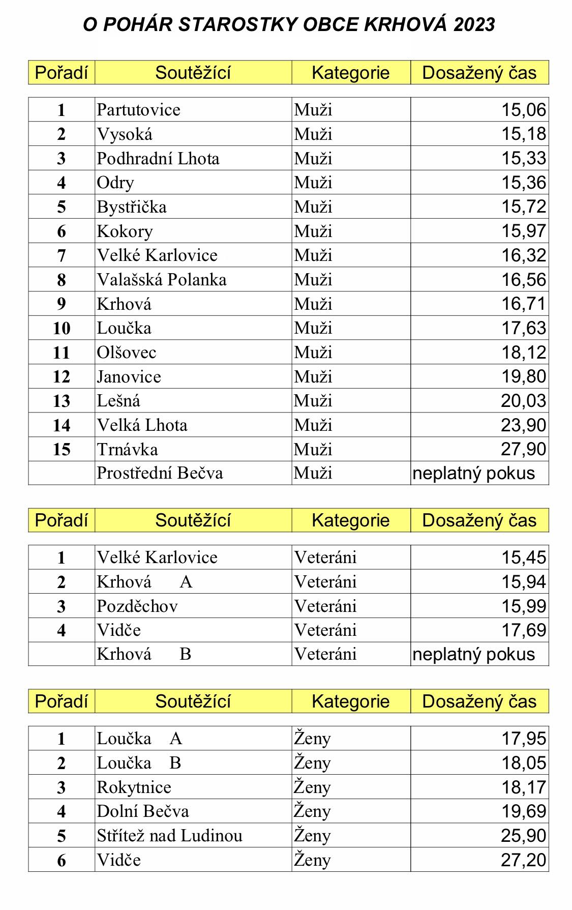 | 24.7.2023 | 9.7.2023, Velké Karlovice Tisňavy - U hasičské zbrojnice , Pohárová soutěž